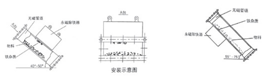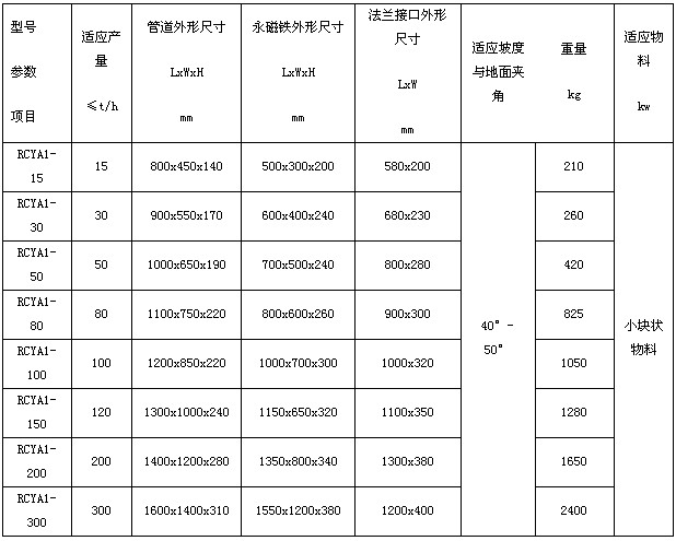 RCYA1、RCYA2系列管道式永磁除鐵器包括無磁管道和永磁鐵兩部分,****于對封閉管道內(nèi)非磁性物料除鐵、永磁除鐵器內(nèi)部采用高性能稀土強磁材料組成復合磁系。具有體積小、磁力大、重量輕、除鐵干凈、方便、無能耗、使用壽命長等特點。適合于無輸送皮帶,只能提供下料溜槽的場合。當散狀物料經(jīng)過管道式永磁除鐵器時,鐵雜物被高場強的永磁鐵所吸附,清除鐵雜質(zhì)時,打開管道****門將雜質(zhì)取出。該設備適用于含鐵量較少的場合,含鐵較多的場合,應選用自卸式除鐵器或RCYG系列精細除鐵器。主要應用于水泥、化工、煤炭、塑料、耐火材料、建材等行業(yè)的下料管道中清除雜物。